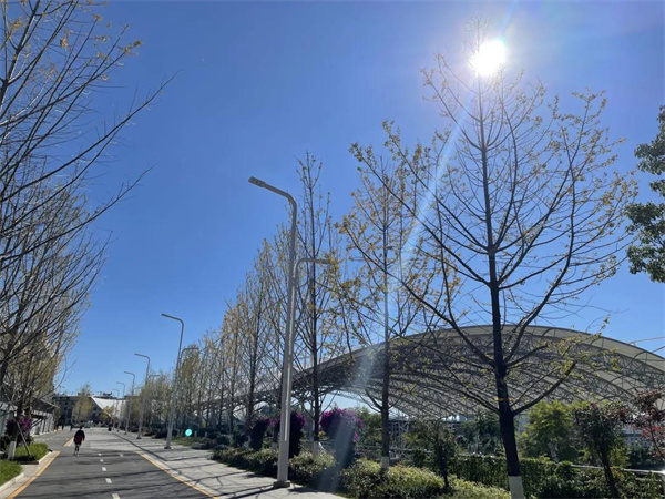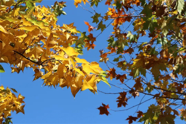 陽(yáng)光+藍(lán)天+金黃樹(shù)葉”的組合