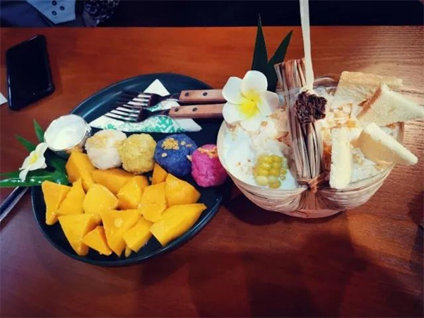 沒(méi)想到吧,糯米飯竟然還能和芒果組成新cp。這道具有泰式風(fēng)格的美食,既可以是一道主食也可以是一道特色甜點(diǎn),粉色、藍(lán)紫色、白色、黃色的糯米飯團(tuán)被大塊的芒果團(tuán)團(tuán)包圍,光是看著就非常有食欲,先來(lái)一勺米飯配上芒果,吃出芒果糯米飯的原汁原味,之后再澆上備好的椰漿,即使是在冬天,你也能吃出一種夏日在芭提雅的度假之感。