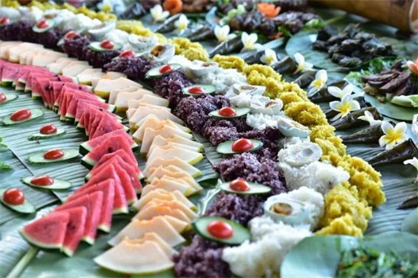 大筲箕上鋪上一層芭蕉葉,將傣族美食集合葷素搭配,加上食材染出的彩色糯米飯和水果,擺出各種精美的造型,用手抓著品嘗,整頓飯都吃得十分獨(dú)特。古樸美味的味蕾盛宴擺脫了傳統(tǒng)餐食的繁文縟節(jié),用原始樸實(shí)的方式呈現(xiàn)在人們面前,頃刻間便能感受到突破桎梏的愉悅,與美味食材親密接觸,回歸質(zhì)樸醇厚的飲食文化之中。