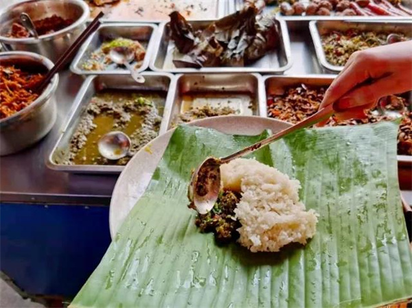 你還在糾結(jié)中午吃啥?大魚(yú)大肉吃膩了,來(lái)份糯米飯如何?西雙版納的糯米飯與其他地方的有所不同,光是配料就有十幾種,而且每個(gè)店家都有自己的搭配創(chuàng)意。除了必不可少的幾種咸菜外,其余的配菜可謂是豐富多樣,將糯米飯放到芭蕉葉上,加上具有傣族風(fēng)味的涼拌雞絲,一份厚實(shí)的烤豬干巴,一塊分量十足的午餐肉,酸辣開(kāi)胃的豇豆和小米辣酸筍,會(huì)吃的還可加一份螃蟹醬,一頓豪華版糯米飯作為午飯,真是又開(kāi)胃,又頂飽,不一樣的特配更是讓人念念不忘。