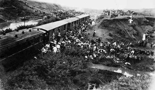 從1903年至1910年之間,在筑路過程中,法國殖民者對中國筑路工人進行了極其野蠻的奴役、壓迫。僅在滇段修筑過程中,除役使云南各族人民外,還從河北、山東、廣東、廣西、福建、四川、浙江等省招募大量民工,前后7年間,總數(shù)不下二三十萬,而被虐待折磨致死者近8萬人。