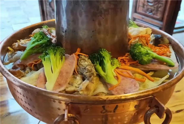 烹飪時(shí),在鍋內(nèi)底部先鋪上一層蔬菜、粉絲、山藥等素菜,上層再將制作好的酥肉、丸子、豆腐等食材放好,擺上現(xiàn)切的火腿片、鮮肉片等,加入燉好的高湯,點(diǎn)燃木炭,待食材吸收了炭火的溫度,浸泡著湯汁的食材味道相互融合,便可享用湯鮮肉美的炊鍋了。