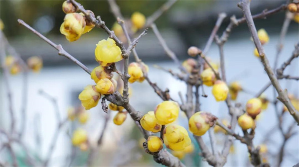 蠟梅寒客開春前,嫩黃的花色如同蜂蠟一般。在這個寒潮方至即走,冷意來卻不留的冬季,蠟梅較往年開得晚了些。