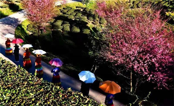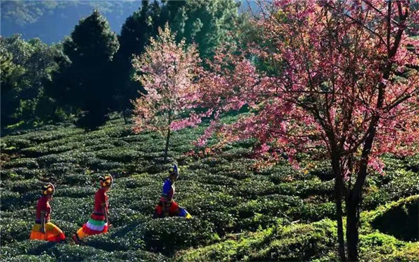 茶園、櫻花、遠(yuǎn)山,宛若一幅色彩斑斕的油畫,滇中秘境最意外的春色悄然來臨。