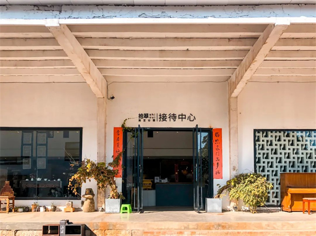 從金鼎山北路14號下車時(shí),一棟巨大的白色建筑便呈現(xiàn)在每一位來者的眼前。沒有巨大的招牌,“拾翠民藝公園”幾個(gè)白色的字體就這么立在路邊,低調(diào)到不想讓人發(fā)現(xiàn)它一般。穿過地面鋪設(shè)的石板路,走到接待中心跟前細(xì)細(xì)打量——這里還殘留著舊時(shí)工廠的痕跡。