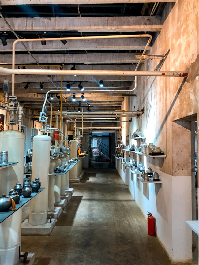 從接待中心左側(cè)出來,往坡上稍走幾步,就能看到那高調(diào)的「斑錫龍金屬藝術(shù)生活館」。這里也是氧氣廠車間的舊址,至今還保留著原來的樣子。這間金屬藝術(shù)生活館就地取材,把生產(chǎn)車間直接改造成了陳列館。