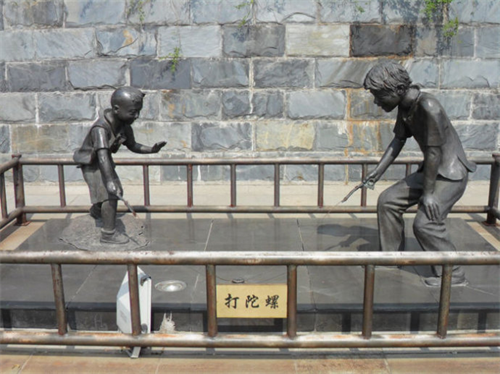 抽陀螺游戲是一項盛行于上世紀40年代的男孩游戲,當時老北京的孩子把抽陀螺叫做“抽漢奸”,因那時日本人侵占了北京城,不少漢奸助紂為虐,他們跟日本鬼子一樣招人恨,老百姓就借抽陀螺時出氣兒,一邊抽一邊說:“抽漢奸,打漢奸,打敗日本,打漢奸?!薄俺闈h奸,打漢奸,棒子面漲一千?!币越庑念^之憤恨。
