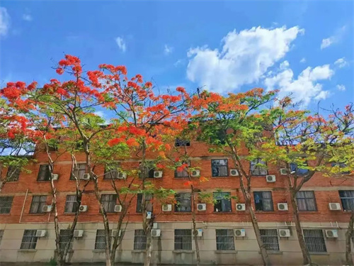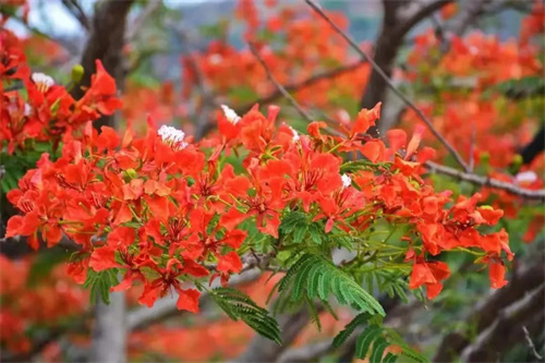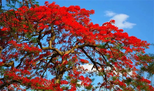夏風(fēng)颯颯,鳳凰花亦隨之搖曳,像飽飲了玫瑰酒似的,泛著紅暈,分外妖嬈,一絲絲淡淡的清香縈繞鼻尖。高大的樹干自然舒展,灑脫自如,花朵相互簇?fù)碇?,像一團(tuán)團(tuán)燃燒的火焰,又像天空中散落的云霞。一朵朵、一團(tuán)團(tuán)、一簇簇的鳳凰花便仰臥在樹梢,火紅一片、絢麗奪目,驚艷了夏日的時(shí)光。移步樹下抬頭仰望,藍(lán)的天、白的云、紅的花、綠的葉,分明是一幅色彩明艷、富麗堂皇的美麗畫卷。比起商業(yè)景點(diǎn)的風(fēng)光,綠汁鎮(zhèn)是那么地低調(diào),默默承載著當(dāng)?shù)厝说囊酪类l(xiāng)愁,也深知腳下土地的悠悠過往。