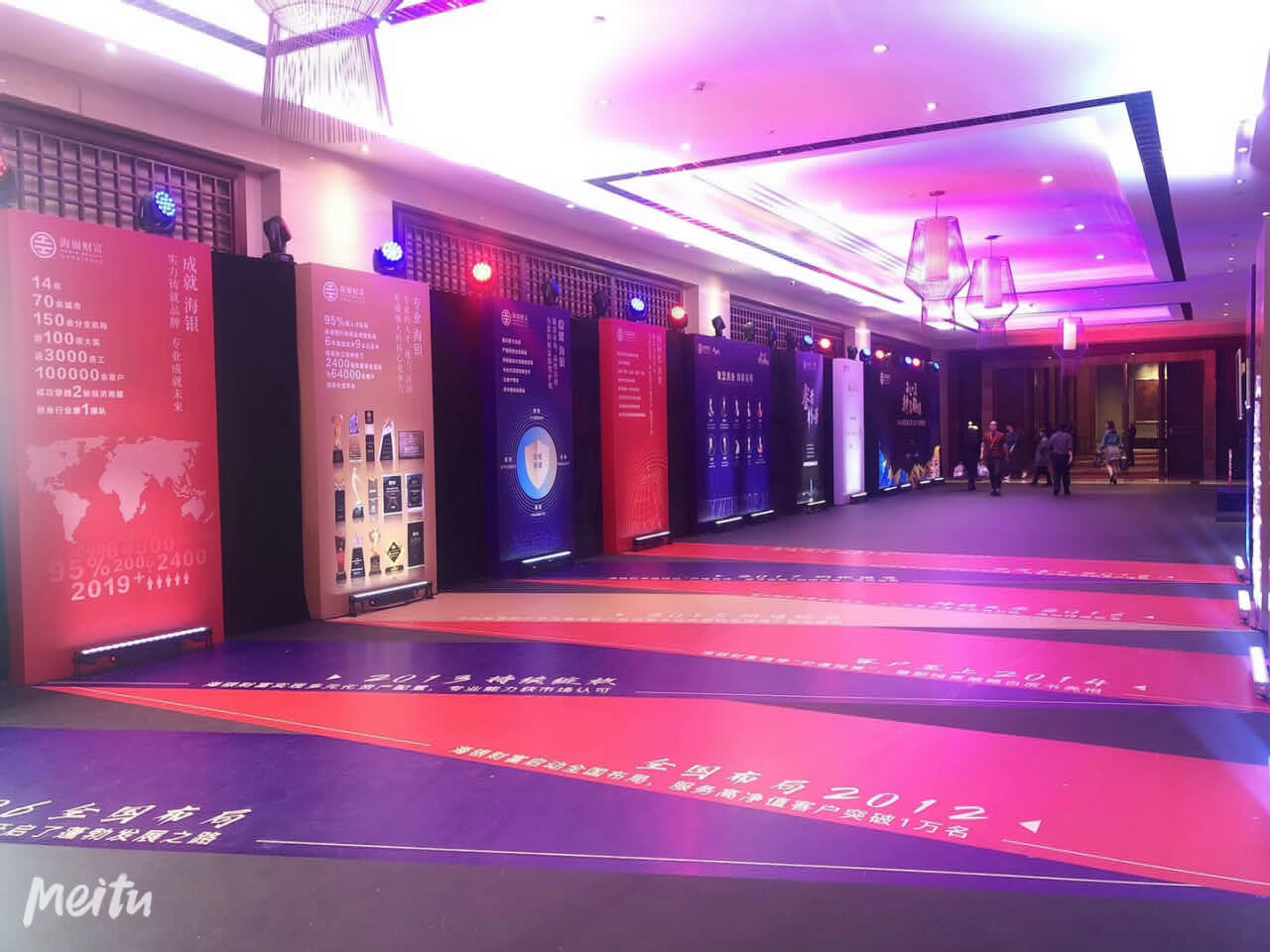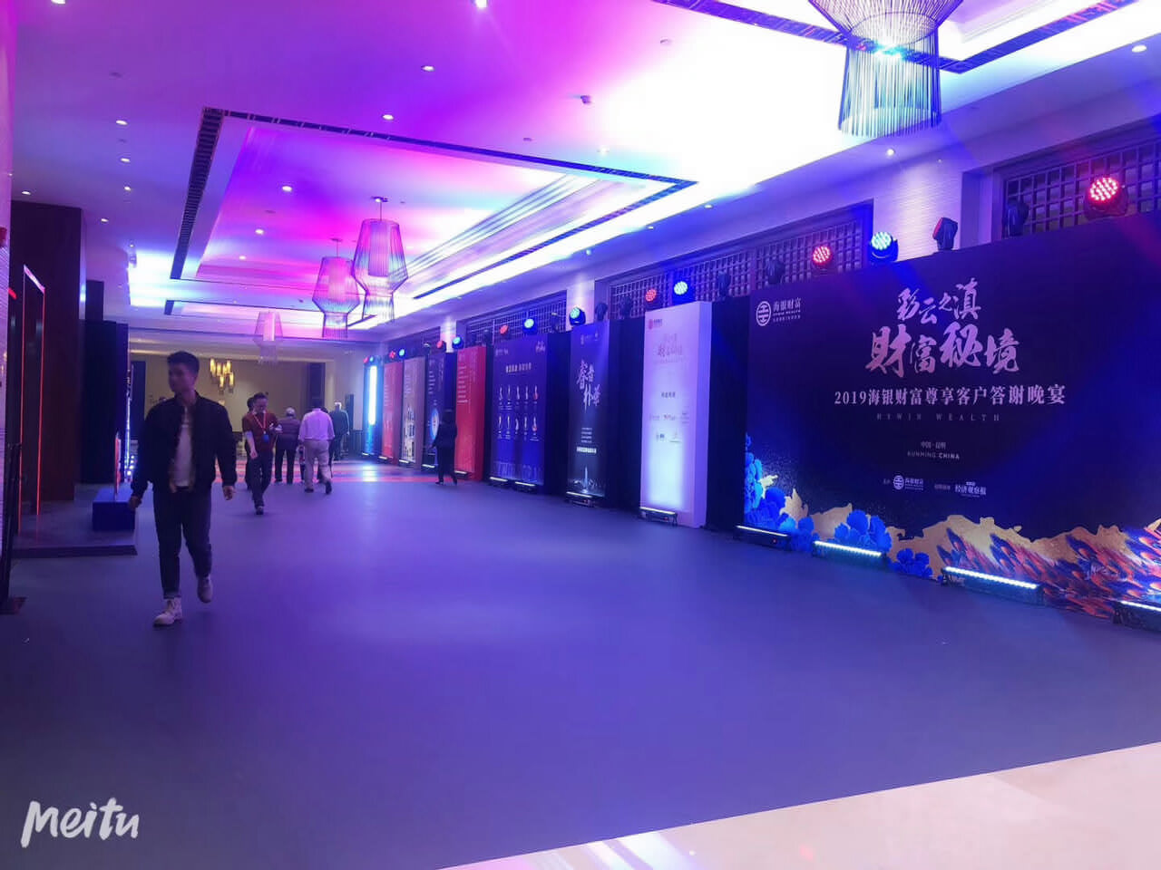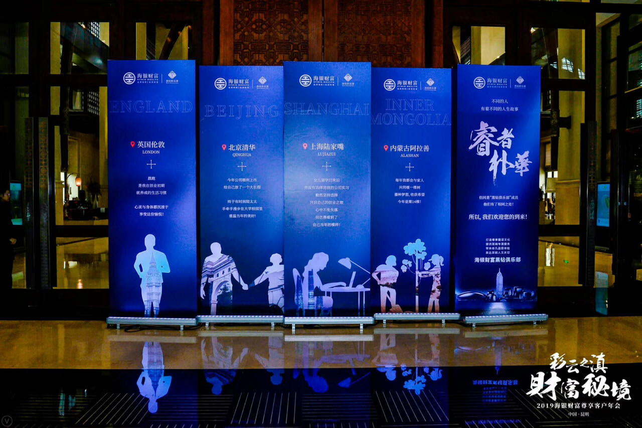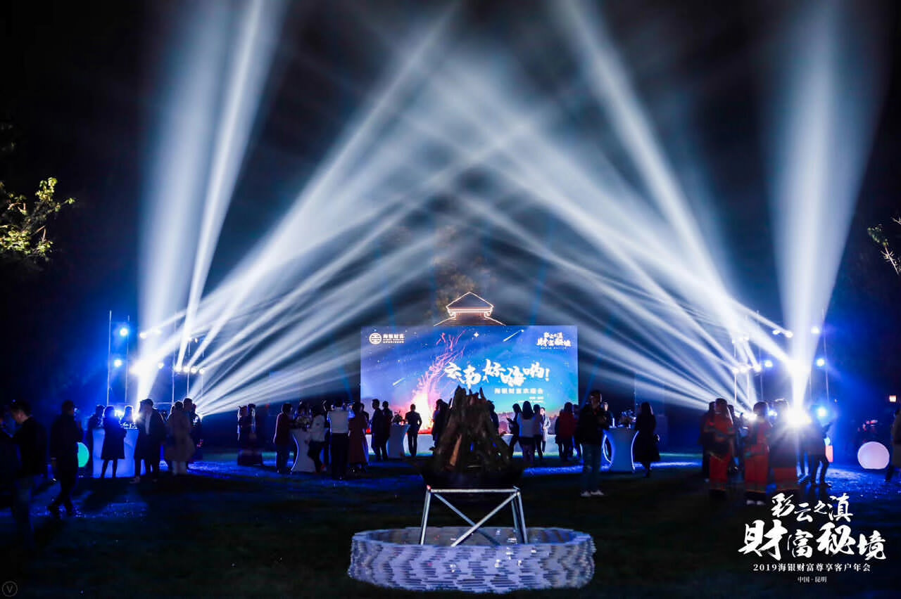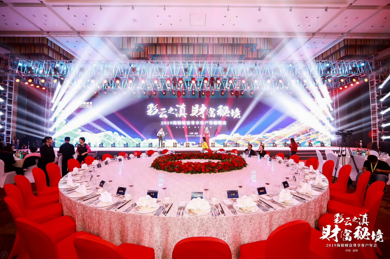 2019年海銀財富尊享客戶年會及答謝晚宴在滇池湖畔春城昆明召開;天行提供會議會展、獎勵旅游、市場活動管理及包括AV搭建、物料制作、活動場地、演藝、拓展、勞務人員等專項資源管理在內(nèi)的專業(yè)會展服務。