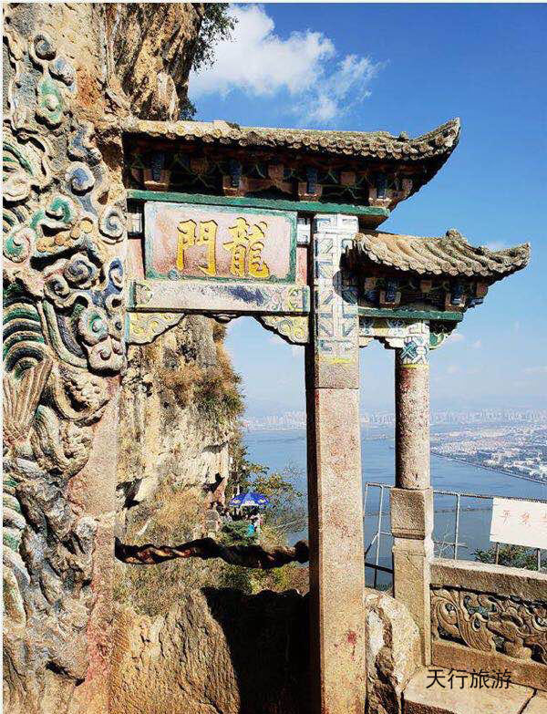 龍門石窟結(jié)構(gòu)布局優(yōu)美,刻工精細(xì),室內(nèi)的魁星、文昌、關(guān)圣皆就石巖鑿成,巧奪天工。登上龍門,在入口處有一圓柱石坊,上書“龍門”二字,并刻有“元寶”,據(jù)說能保佑人發(fā)財(cái)發(fā)達(dá),吉祥如意,所以游人都喜歡用手摸一下。入門有一石欄轉(zhuǎn)護(hù)的半圓形小月臺,站在月臺眺望,人見上迎天風(fēng),下臨絕壁,五百里滇池?zé)煵ê泼?,云蒸霞蔚?/span>