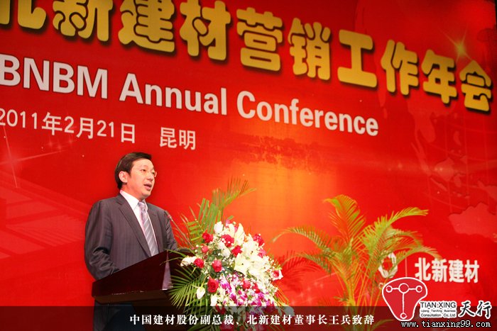 2月21日,北新建材2011年?duì)I銷工作年會(huì)在昆明隆重舉行,中國(guó)建材集團(tuán)董事兼中國(guó)建材股份有限公司總裁曹江林出席大會(huì)并做重要講話,《中國(guó)建材報(bào)》社社長(zhǎng)陳才來(lái)、《中國(guó)建設(shè)報(bào)》社副社長(zhǎng)翟建、《中華建筑報(bào)》社總編鄧千等應(yīng)邀出席大會(huì),北新建材董事長(zhǎng)王兵致歡迎辭并做營(yíng)銷工作報(bào)告。