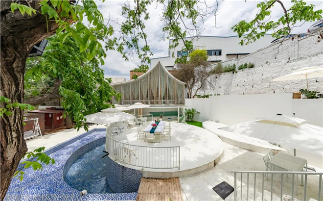 民宿是一棟純白的小樓,遠(yuǎn)看上去就像一個純白色的城堡,干凈的白色設(shè)計清新夢幻,布置也超級浪漫,搭配月牙形狀的露天泳池非常美麗。