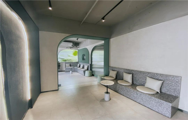 一進(jìn)門(mén)是大堂,再往里走,半圓拱門(mén),桌椅落地窗綠植,深綠色、水磨石 灰色為主,整體安靜舒服。