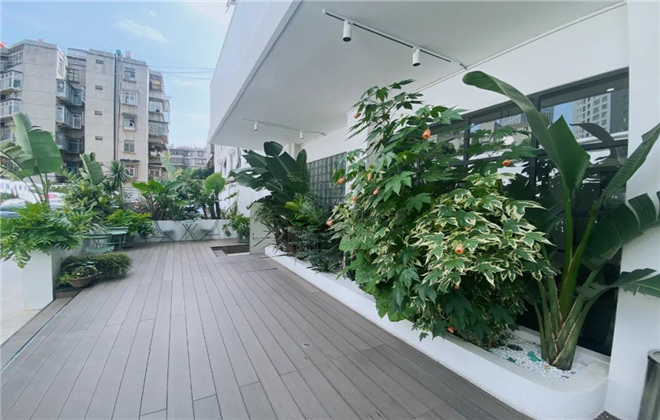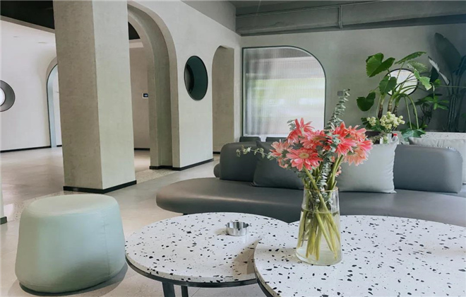 一樓整個(gè)公共開(kāi)放區(qū)域每個(gè)角落都可以出片,桌上點(diǎn)綴的鮮花與周?chē)G植相映成趣。