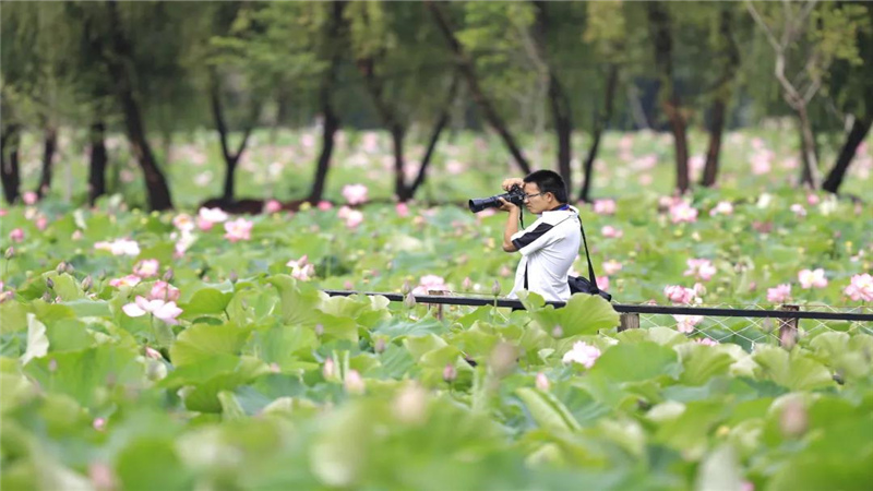 湖內(nèi)種有荷花,夏季來(lái)臨時(shí),這里成為人們賞荷花的佳地?!傲潞苫ㄏ銤M湖,紅衣綠扇映清波。”那蓮葉田田,菡萏妖嬈的畫面,被攝影師留在了一張張照片中。