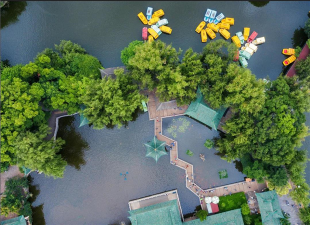 公園以翠湖為中心,由縱貫?zāi)媳钡娜畹毯椭蓖|西的唐堤,將翠湖分成五片景區(qū)。