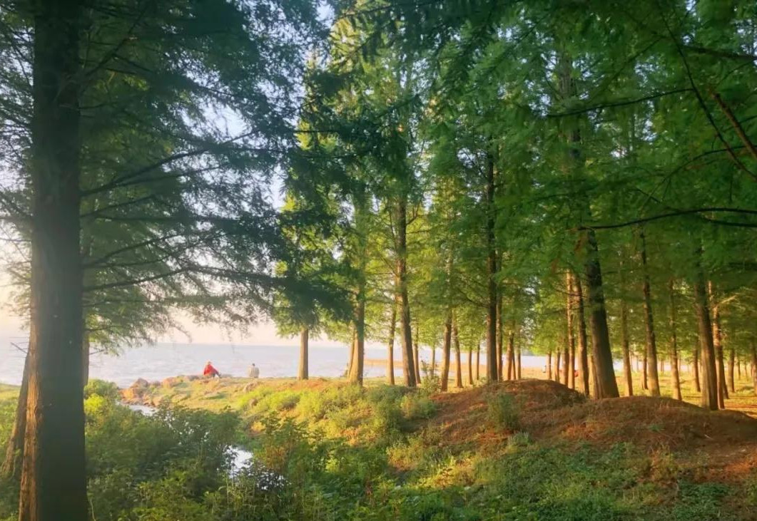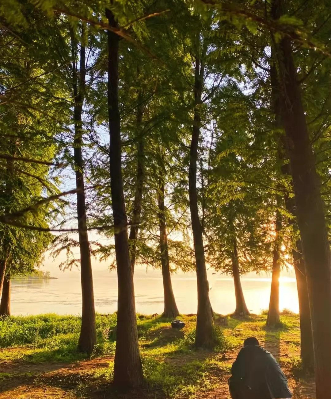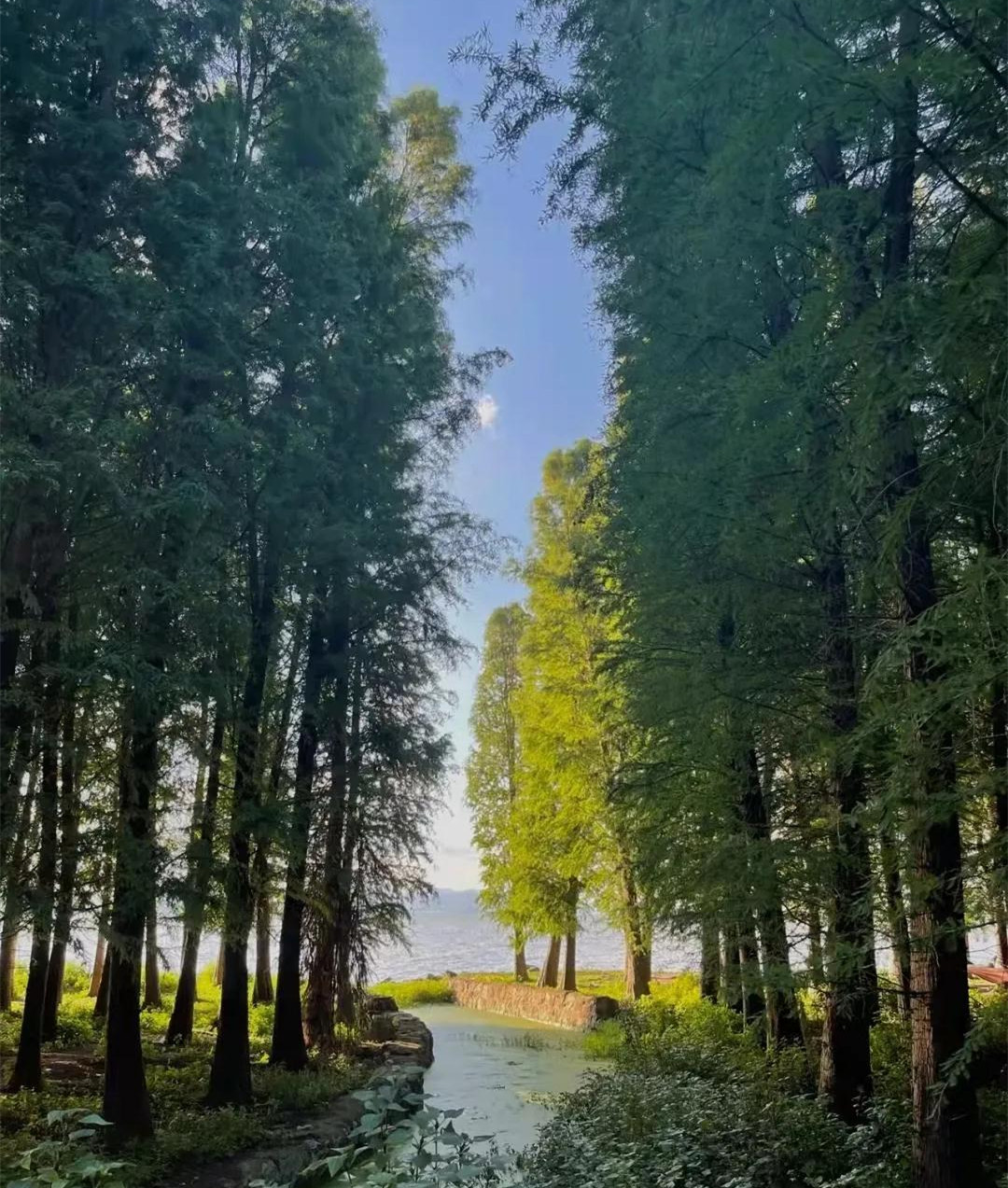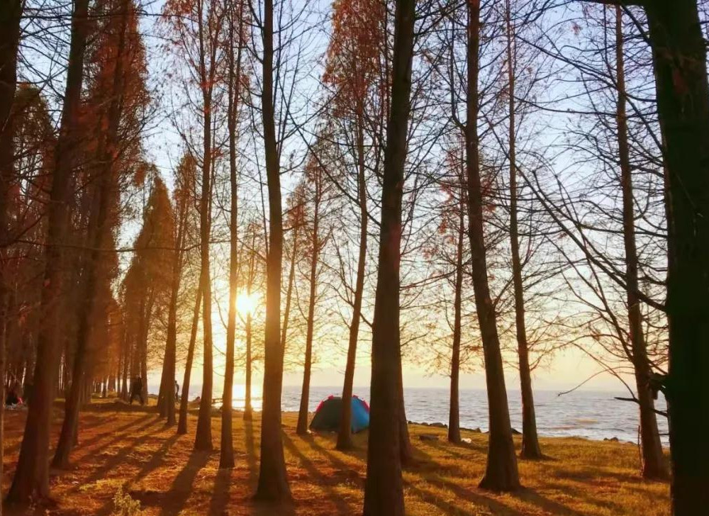 滿是綠意的小森林,雖已步入深秋,滇池邊的水杉卻仍是郁郁蔥蔥,偶爾才有一株泛出些許的紅。