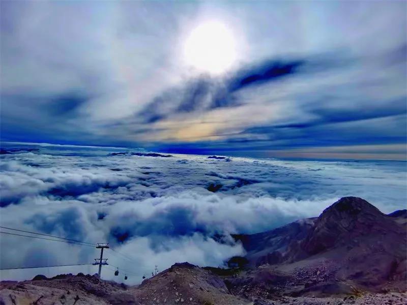 “靈山蓄云彩,紛郁出清晨?!鞭I子雪山常年云霧繚繞、紫氣升騰。那些云朵,或靜止于山谷,或橫睡于半腰,或涌動(dòng)于轎頂,變化萬(wàn)千,山石如洗,空氣清新。遠(yuǎn)山如黛,云海奔流,時(shí)而上升,時(shí)而下墜,時(shí)而回旋,時(shí)而舒展,時(shí)而成群集結(jié)蔚然成海,任性翻涌。