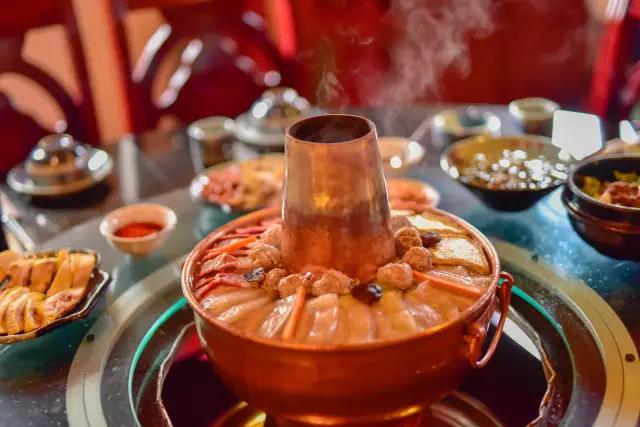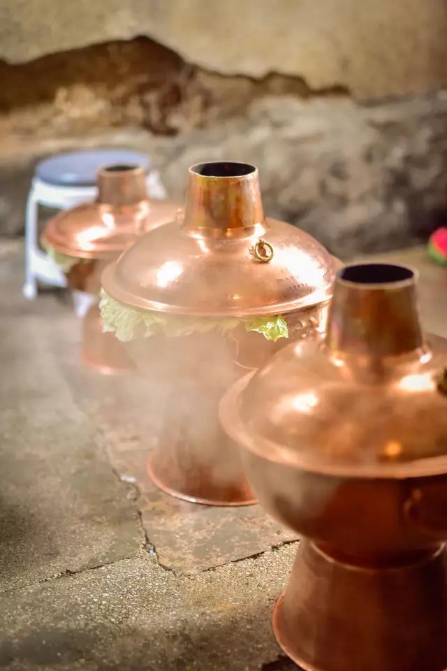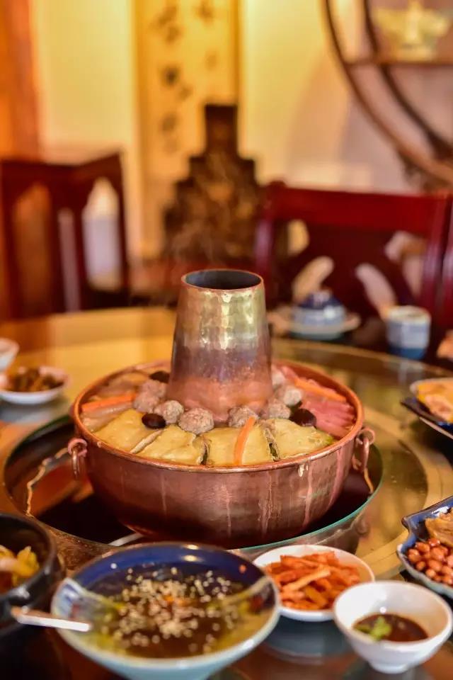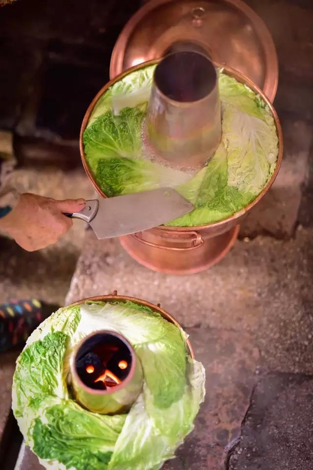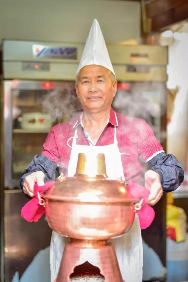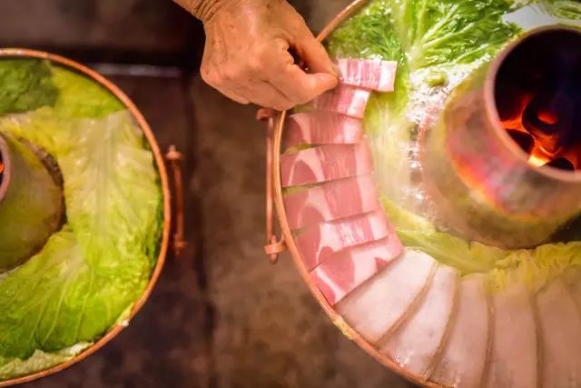 先將熬制好的高湯盛入銅鍋,放入些許鹽、胡椒等調(diào)料,舀入幾勺豬油,蓋上鍋蓋,在煙囪中加入無煙碳生火,等待高湯煮沸。高湯由店主憑借自己幾十年的經(jīng)驗,獨家熬制。“放入土雞、排骨、筒子骨、老鴨同煮,水沸之時,拂去沫子,待用筷子能戳穿肉時取肉,再等雞能被戳穿時,取雞,約一小時許,然后再把筒子骨取出,涼后剔肉,肉涼拌或打蘸水食之。此時湯鮮、色白,可謂高湯。古人無味精,故用雞、骨等熬制成高湯,可當味精,故而炊鍋一般不放味精,放適量鹽即可?!瘪R姐告訴我們,熬制高湯用的都是礦泉水。