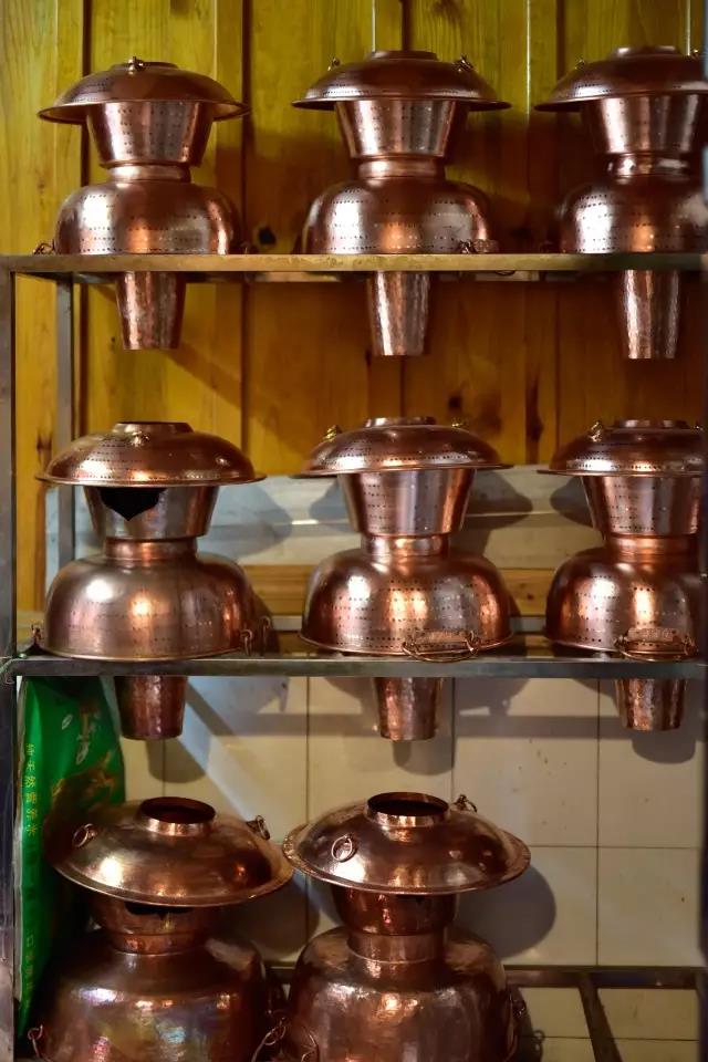 走進食府正房,左右兩邊各擺有餐桌,中央設有一茶桌、一方桌,方桌上陳列著一口銅鍋。煮通海炊鍋菜用的就是這樣的銅鍋。在古城中心街區(qū),有多家店鋪售賣銅鍋,大大小小的各類銅鍋擺滿店面,最小的銅鍋夠四五人同時食用炊鍋菜,大的足夠十余人使用,有的銅鍋泛著锃亮的光,有的表面則附著一層黑色的“包漿”。