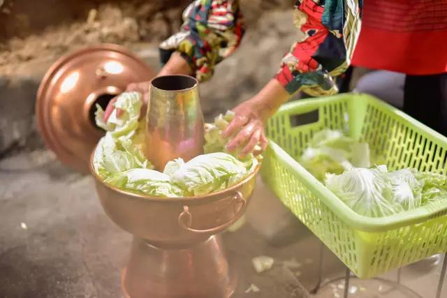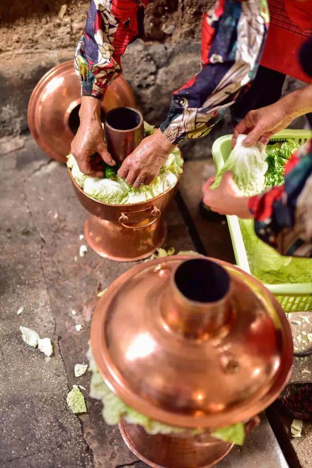 待高湯沸騰,放入新鮮玉米、甜藕、茨菇、小南瓜、芋頭,往上鋪幾層厚厚的山地白菜葉和茴香。準備妥帖,蓋上鍋蓋,烀上十多分鐘。別小看這幾樣普通食材,它們是店家的經(jīng)驗之選?!拔覀円矅L試過放入其他時令蔬菜,如紅薯、洋芋等等,煮出來的味道始終不理想。有些食材不耐煮,融化到高湯里會影響高湯本身的味道?!瘪R姐說:“保留下的菜品,是我們經(jīng)過多次試驗總結出來的,味道最為上乘?!?