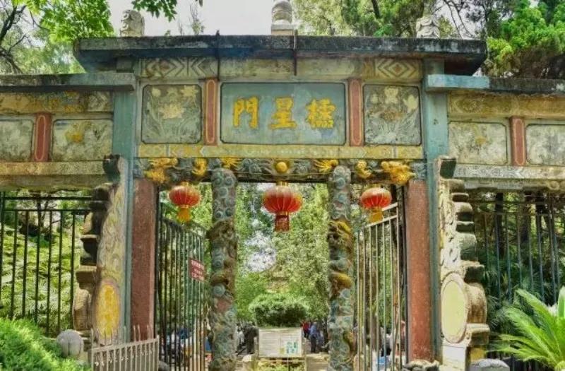 欞星門,本為祭天的禮制性建筑,文廟中的欞星門表示像尊天一樣尊孔。昆明文廟欞星門為四柱三門花崗石建筑,高5米、寬10余米,平頂,中置葫蘆寶頂,抱鼓石夾沖天柱。中門稍高,枋額高約1.5米,分為三格,中格鐫刻楷書“欞星門”三字,左右兩格彩繪圖案,門下加有蟠龍抱柱兩根,抬雙龍望日枋梁。
