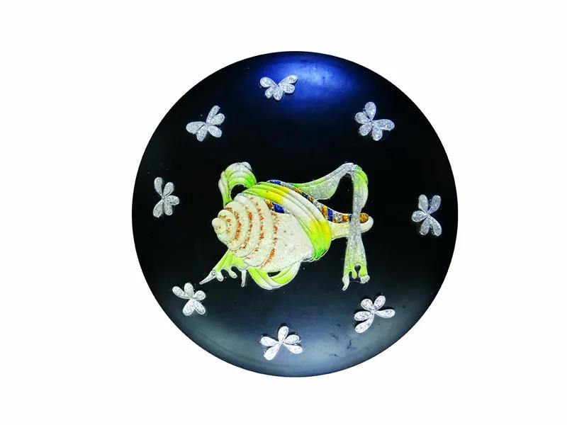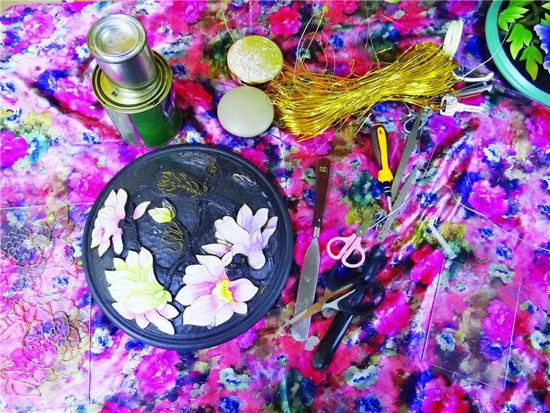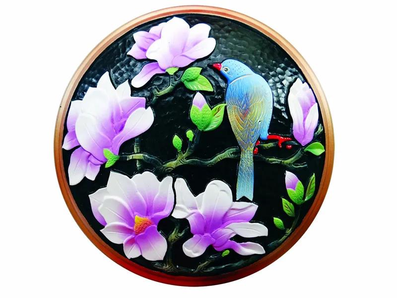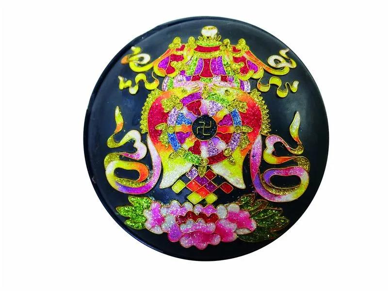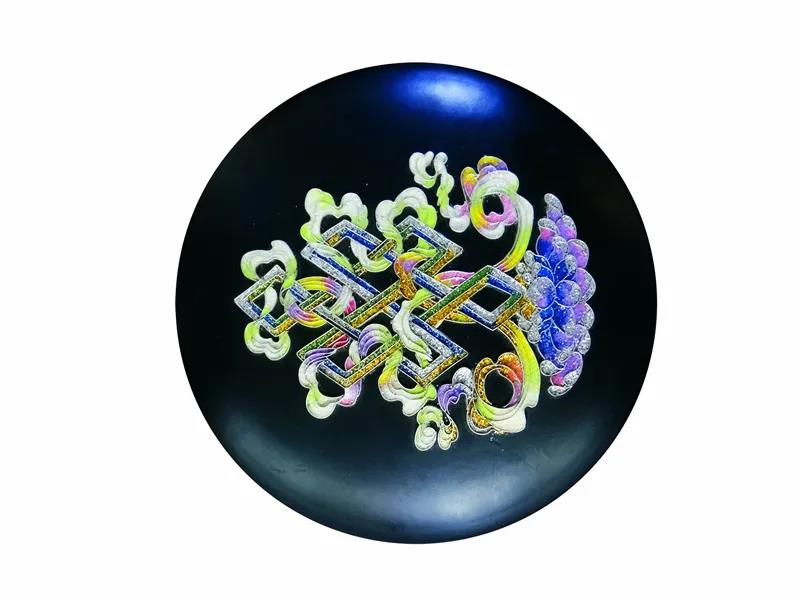 傳統(tǒng)的景泰藍制作工藝為:先描圖后掐絲,再上釉,后反復(fù)燒制,工序可達上百道。而云南掐絲彩嵌黑陶是將釉料燒制好研磨成細粉再掐絲作畫,將五彩艷麗的釉料粉鑲嵌在黑陶上,將原來的上百道工序簡化為十多道工序。成品具有防水、防腐,不易褪色的特點。