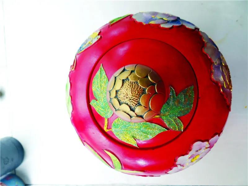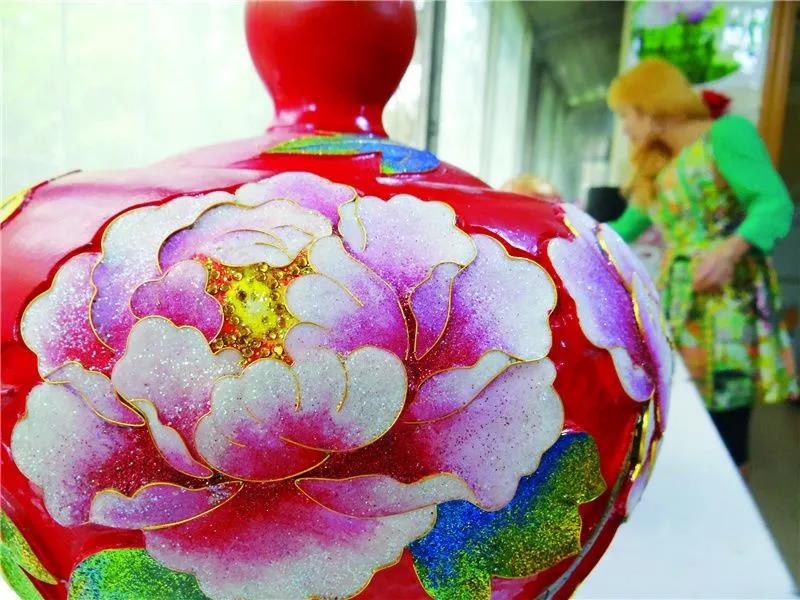 大紅的底色上,金絲勾勒出的數(shù)朵牡丹花嬌艷綻放,幾只蝴蝶在上面翩翩飛舞,點綴其間的金粉若隱若現(xiàn)。這是掐絲彩嵌黑陶工藝品“寶葫蘆”,由三個部分組合而成,聚寶盆寓意聚福聚財,中部和瓶頸組成的花瓶寓意平安。