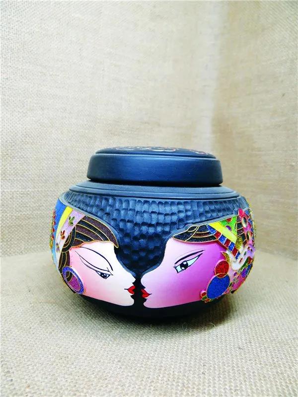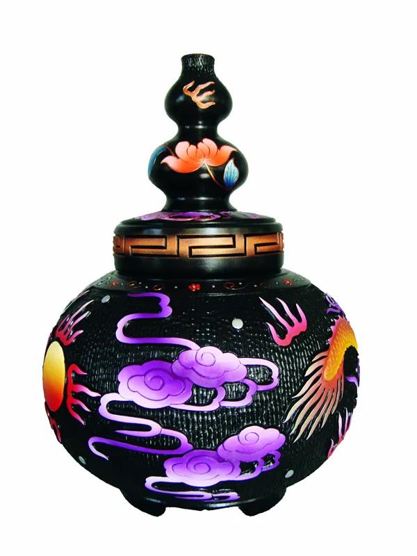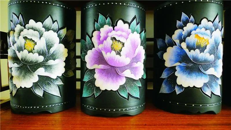 除掐絲彩嵌黑陶外,學(xué)習“云南畫派”畫家的黑陶彩繪系列產(chǎn)品,運用了云南重彩畫工藝,用不浸水不褪色的丙烯顏料,在燒制成的半成品陶體上做畫,最終形成具有濃郁云南民族特色的黑陶重彩工藝品。