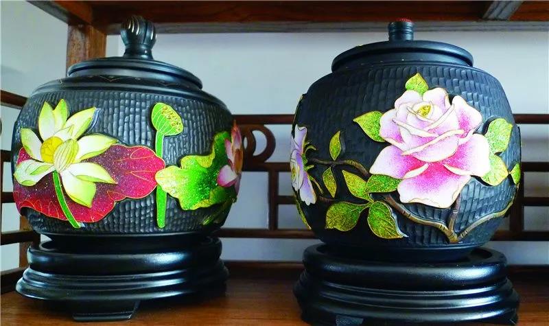 掐絲完成后是上色環(huán)節(jié),掐絲彩嵌黑陶以色彩靚麗、清新自然為佳。由于陶罐的周圍呈曲面,上色時釉料容易流淌出來,在一周內(nèi)經(jīng)歷 10 多道上色,才能讓釉料豐滿貼合。