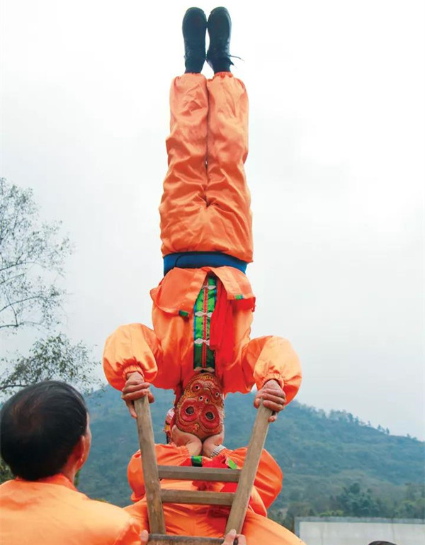 “鉆圈難就難在表演者需要連下5圈,最后雙手懸空倒掛在最后一圈,時間在1、2秒內(nèi),動作還要精準(zhǔn)流暢?!敝窀晚敹吮硌菡叽怪本嚯x地面足有兩層樓高,可謂驚險刺激,觀者無不屏息凝神,拭目以待,高竿舞獅因此又被昭通作家譽為“針尖上的舞蹈”。