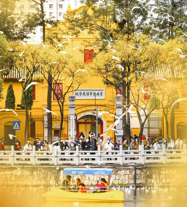 旭日東升、萬物蘇醒,晨練的人們走進(jìn)處于昆明鬧市區(qū)的翠湖公園。他們穿著不同的服飾,跳著不同的舞蹈,還有不同的面容與表情,一切都是那么自然而和諧。湖面上,你可以看到各類水鳥在嬉戲和鳴,享用春城碧水的溫情。漫步翠湖之畔,你會(huì)看到一棟杏黃色的轉(zhuǎn)角式正方形建筑物,兩層土木式的樓房,讓它顯得更加古樸而莊嚴(yán)。雖然隨著歲月的變遷,建筑已經(jīng)變得有些老舊,但你仰視那高聳的門樓與飛揚(yáng)的檐角,就能立即感受到它曾經(jīng)的威嚴(yán)與肅穆,定睛一看,門牌上赫然寫著——云南陸軍講武學(xué)校。