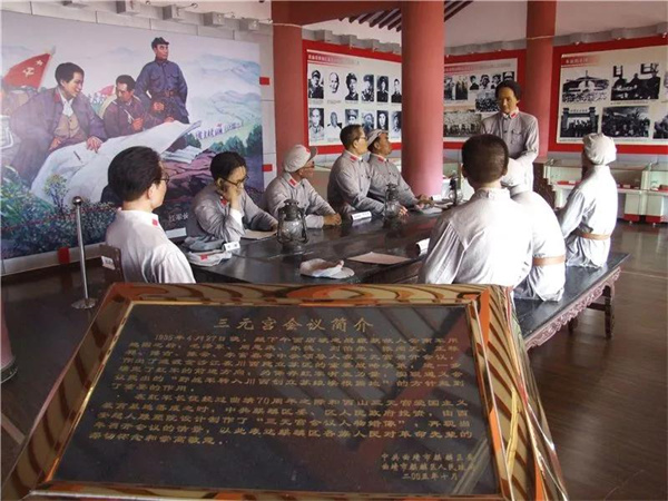三元宮愛國主義教育基地以大量的圖片、文字、革命文物和文獻資料等,生動再現(xiàn)了三元宮會議的歷史。在中國歷史上,三元宮會議是紅軍長征途中召開的一次重要會議,這次會議正確分析了中央紅軍當時所處環(huán)境及敵我斗爭形勢,作出了西進北上迅速搶渡金沙江,到川西建立蘇區(qū)的重大戰(zhàn)略決策,對保存紅軍有生力量,實行戰(zhàn)略轉(zhuǎn)移,順利渡過金沙江,都具有重大的決定性的意義。