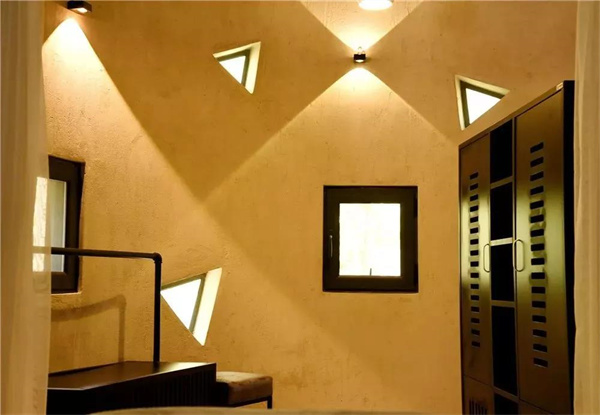 值得一提的是,每間房間設(shè)計(jì)師都在墻壁上,設(shè)計(jì)了三角形狀的窗戶,這些三角窗供給房間采光的同時(shí),本身以三角的形狀給人奇妙夢幻之感。床的正上方,留有鏤空的房頂。所有休息區(qū)域的取光,都是依靠鏤空的房頂自然供光。正因如此,在每一個(gè)星河燦爛的夜晚,伴隨著房間舒緩輕柔的音樂,在滿天星月的陪伴下,安然入夢。