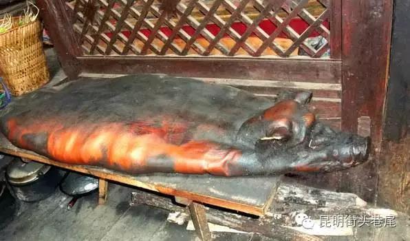 琵琶豬是納西摩梭人傳統(tǒng)風(fēng)味食品,將宰好的豬去除內(nèi)臟,抹上花椒、鹽等調(diào)料,用細繩縫嚴,用大木板石頭等壓制,成品的形狀好似琵琶,故稱“琵琶豬”。