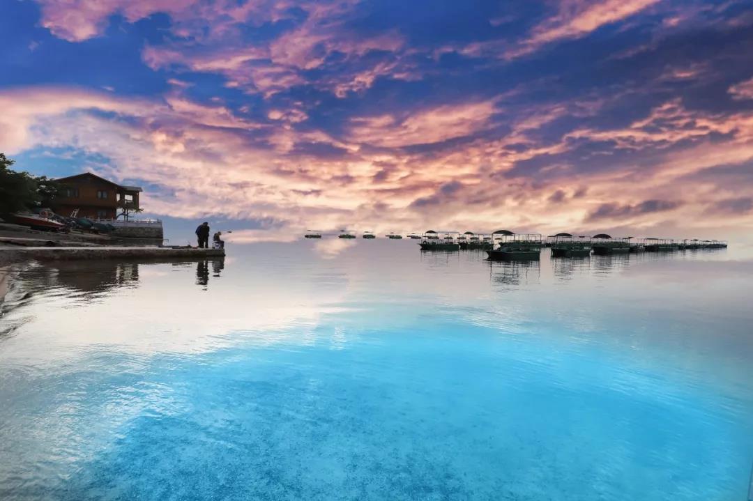 撫仙湖就像它的名字一樣充滿仙氣,湖水藍(lán)得晶瑩剔透,如寶石般鑲嵌在群山之間。從日出到日暮,蔚藍(lán)的天空與純凈透藍(lán)的湖水交織,勾勒出水天一線的美麗畫卷。